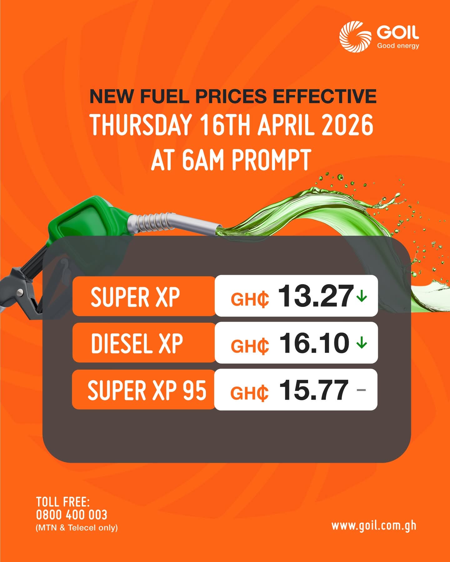 GOIL has reduced pump prices at all stations nationwide from 6AM Thursday, April 16, even as Middle East tensions keep global crude oil prices high.