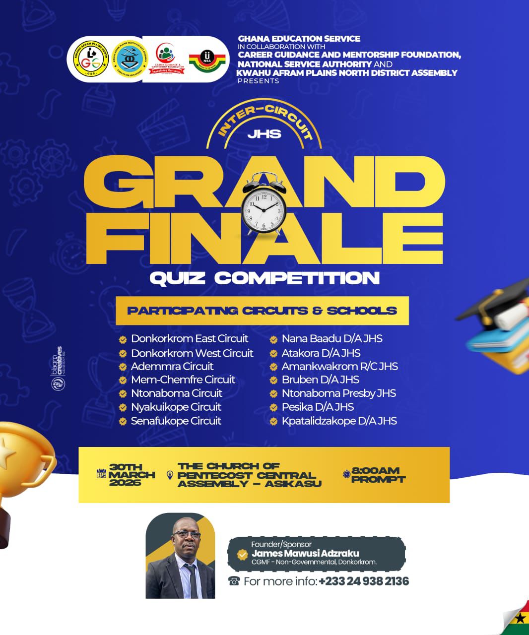 The Inter-Circuit JHS Grand Finale Quiz Competition is in conjunction with The Ghana Education Service, in collaboration with the Career Guidance and Mentorship Foundation, National Service Authority, and Kwahu Afram Plains North District Assembly.