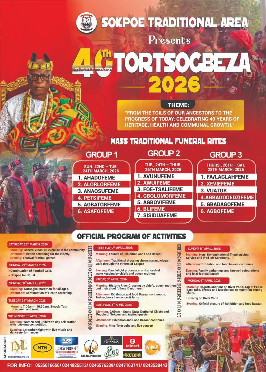 The Sokpoe Traditional Area is gearing up for its grand 40th Tortsogbeza festival in 2026, themed _“From the Toils of Our Ancestors to the Progress of Today: Celebrating 40 Years of Heritage, Health and Communal Growth.”_ The celebration will blend traditional rites, music, sports, and community health initiatives into a vibrant cultural showcase.