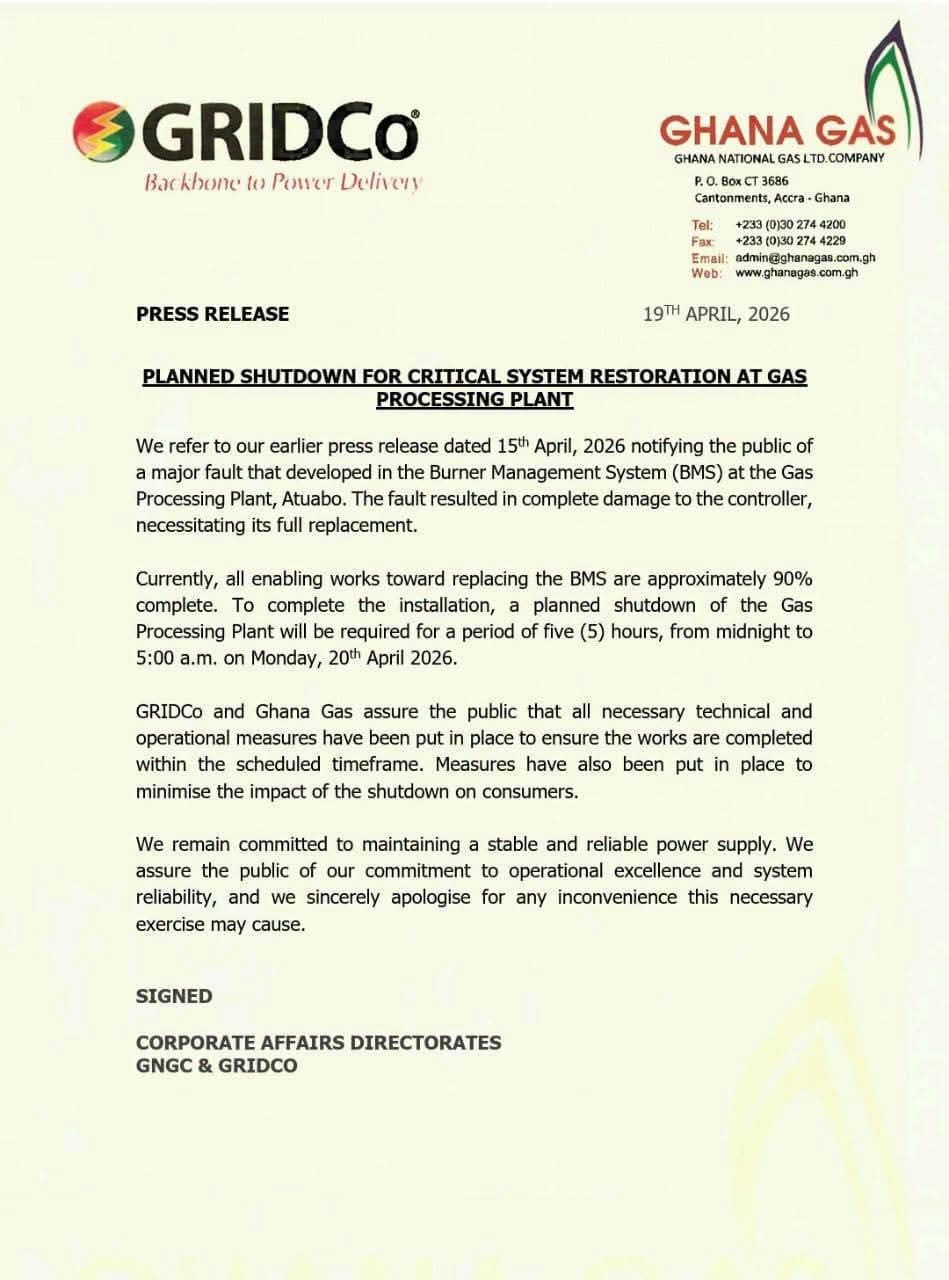The Ghana Grid Company Ltd (GRIDCo) and Ghana National Gas Company (Ghana Gas) have announced a planned five-hour shutdown of the Atuabo Gas Processing Plant on Monday, April 20, to complete urgent restoration works.