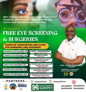 The Member of Parliament for Keta, Kwame Dzudzorli Gakpey, has kicked off a massive free eye screening and surgery programme in the Keta Municipality.