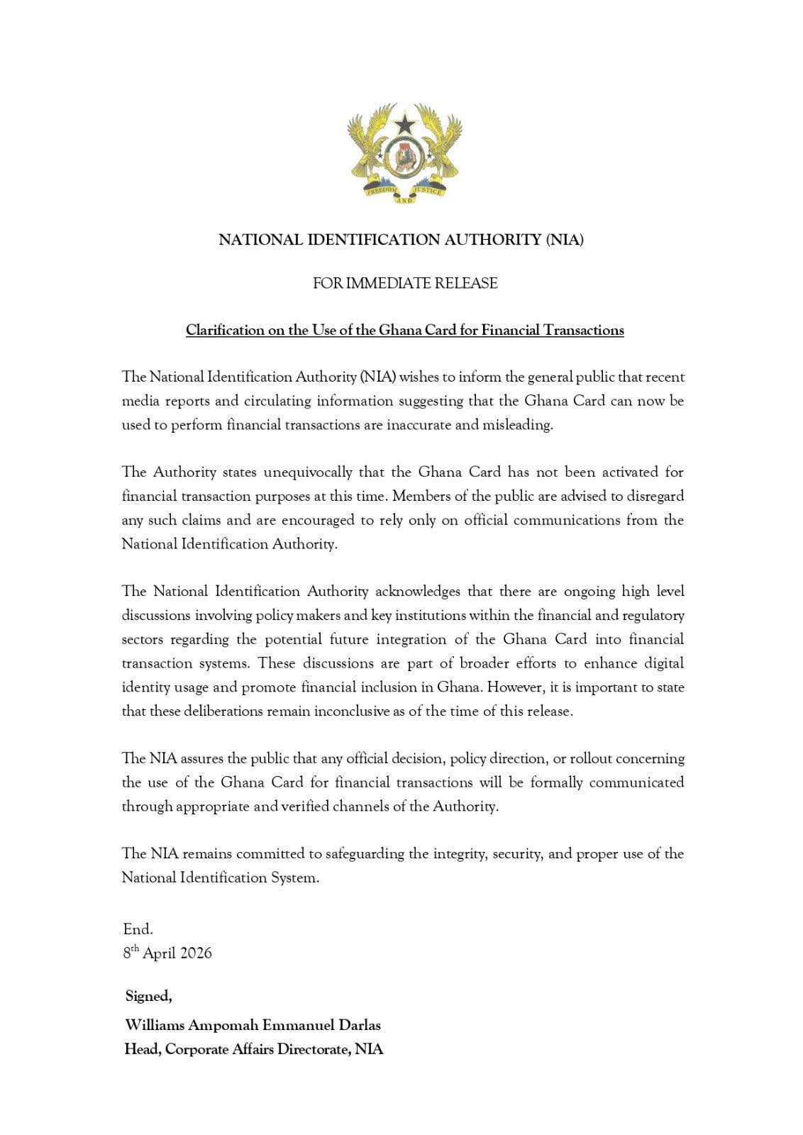 The National Identification Authority (NIA) issued a press release titled “FOR IMMEDIATE RELEASE” to set the record straight about the Ghana Card. In the statement, the NIA explained that the Ghana Card has *not* been activated for financial transactions, debunking recent rumors and media reports suggesting otherwise.