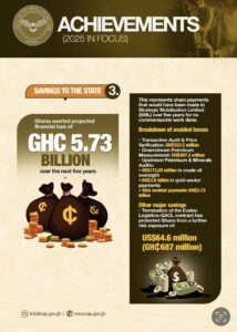 According to the statement, the OSP’s work has resulted in substantial financial recoveries, including clawing back GHC 6.5 million and US$2 million, seizing assets valued at over GHC 102 million, and preventing an estimated national loss of GHC 5.73 billion—funds that could have gone into education, healthcare, and infrastructure.