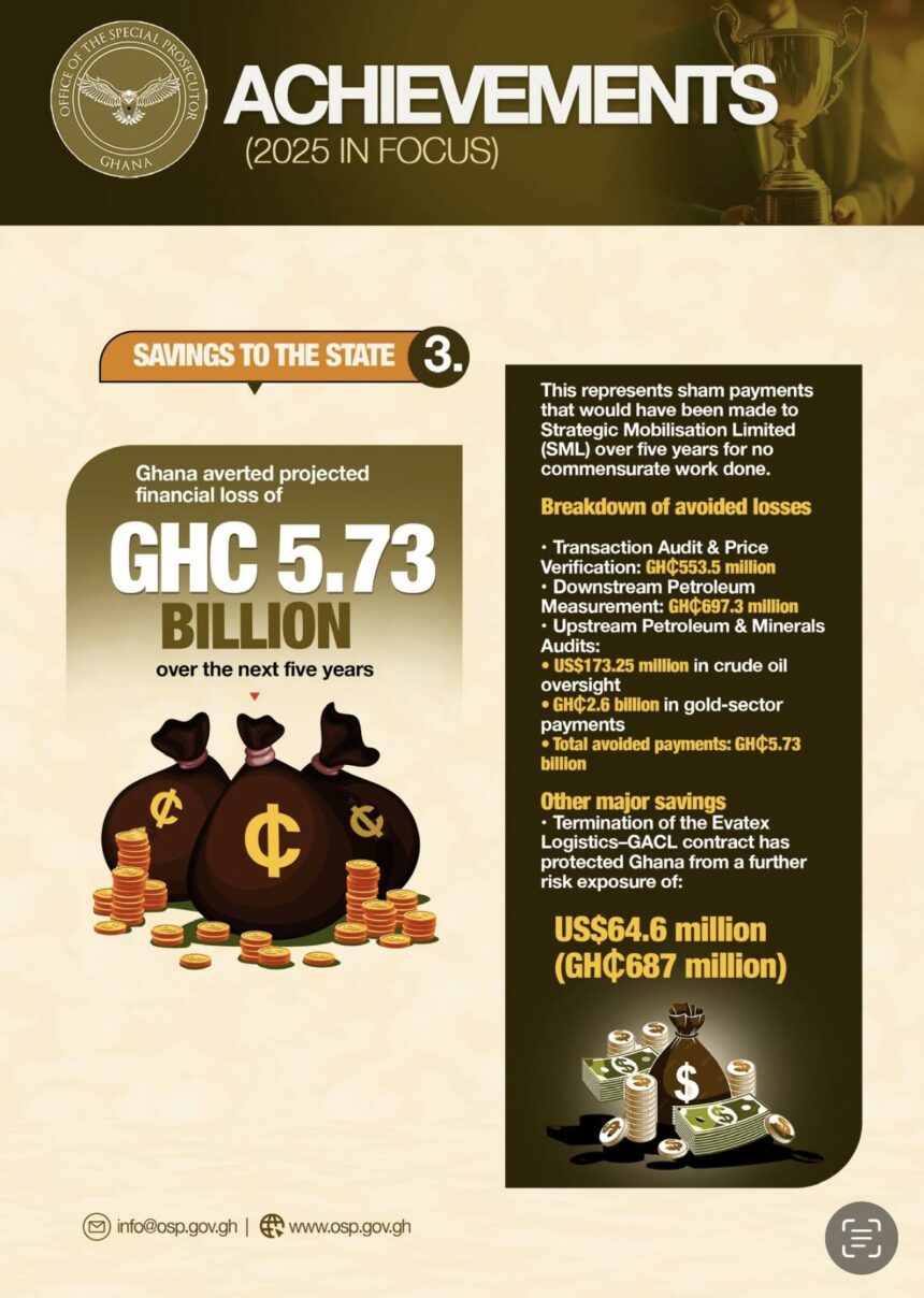 According to the statement, the OSP’s work has resulted in substantial financial recoveries, including clawing back GHC 6.5 million and US$2 million, seizing assets valued at over GHC 102 million, and preventing an estimated national loss of GHC 5.73 billion—funds that could have gone into education, healthcare, and infrastructure.