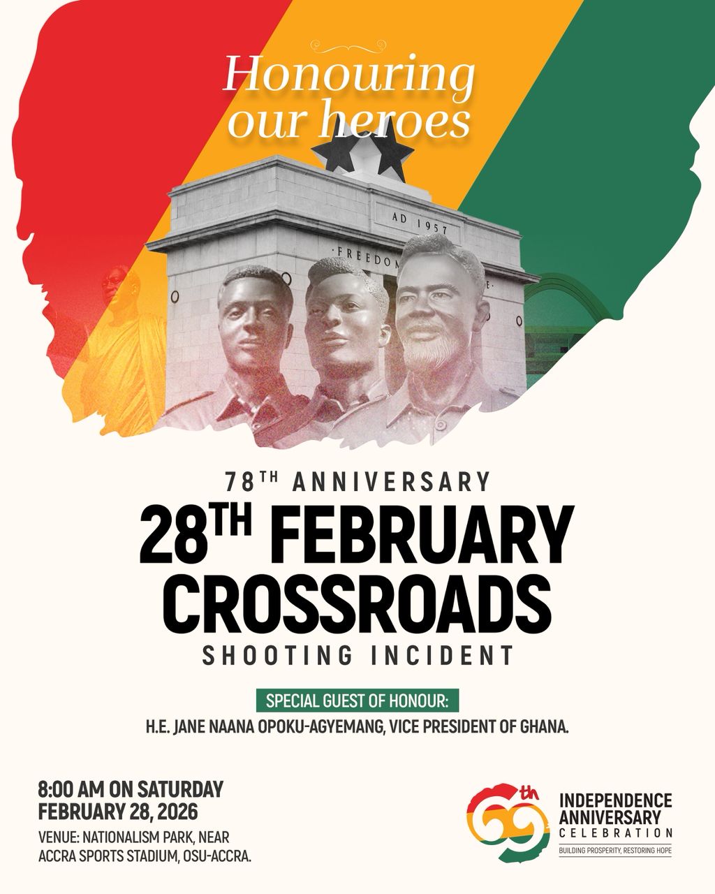 The solemn ceremony, taking place at Nationalism Park near the Accra Sports Stadium in Osu-Accra, will pay tribute to the nation’s heroes who fought for freedom and justice.