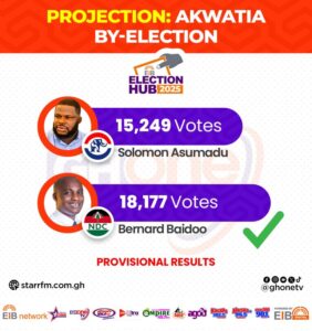 The NDC’s candidate, Bernard Bediako Baidoo, secured a decisive victory in the hotly contested by-election, polling 18,199 votes (54%) against the opposition New Patriotic Party (NPP) candidate, Solomon Kwame Asumadu, who garnered 15,235 votes.¹